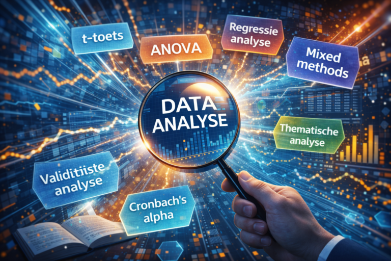 Een praktische werkwijze is om vooraf per onderzoeksvraag kort te noteren hoe je deze gaat analyseren. Ga je gemiddelden vergelijken? Ga je coderen op thema’s? Ga je verbanden toetsen?